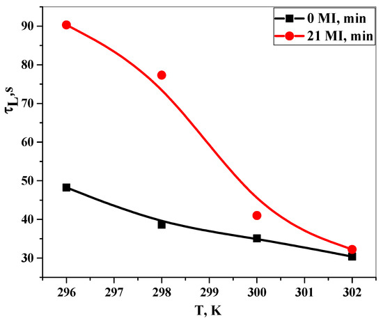 Relationship of Sp. ambiguum lifetime as a function of temperature for the Lvf·Hh samples with MI times 0 (before McAct) and 21 min (after McAct).