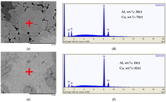 Several zones of the microstructure of the Cu-10 wt.% Al alloy obtained from the powder blend using the fine Al powder (5 min, 40 MPa) are shown in Figure 4a,c,e. The spectra taken from the points marked in the images are presented in Figure 4b,d,f. It is seen that, as one moves from dark-gray to gray, and then further to light-gray regions, the Al signals become weaker, and its concentration decreases. The brighter areas are richer in copper. In the alloys shown in Figure 3d,f, the dark islands appear to be CuAl2, which is present at a low concentration. Increasing the holding time of the sample at the sintering temperature to 20 min leads to further alloying between the metals, the dark-gray areas disappearing from the microstructure of the alloy (Figure 3h).