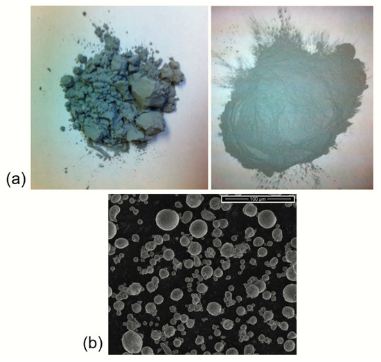 (a) Comparison of raw (left) and surface-treated (right) aluminum powders. Reduction in cohesion and surface water content can be seen by the decrease in clumping behavior. (b) SEM image of gas-atomized aluminum powder, showing spherical particle and agglomerates (SD16).