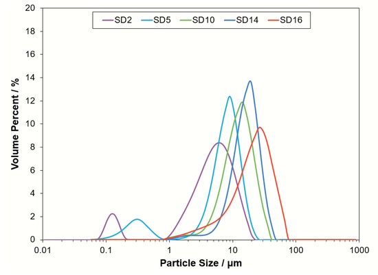 Particle size distribution plots for SD2, SD5, SD10, SD12, and SD16.