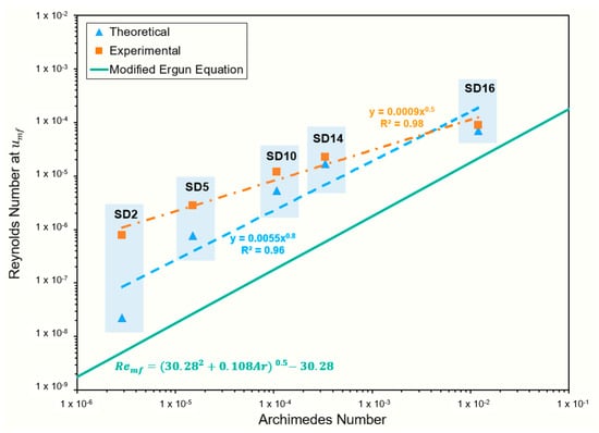 A plot of Re vs. Ar is shown in Figure 4, and the Ergun Equation (7) is plotted for reference. The power function generated from the MTES surface-treated powder data shows a similar relationship between the Ar and Re to the modified Ergun equation. The values calculated for treated larger particle sizes are reasonably correlated with the Ergun equation, differing from 3–20% based on the theoretical value. The smaller particles tended to deviate from this line, showing higher-than-anticipated Reynold’s numbers. SD2 and SD5 had the lowest Ar numbers, which is consistent with their low density. The differences observed here are likely a result of the surface treatment. Direct comparison to the untreated particles was not possible due to the non-uniform fluidization of their powder beds during analysis.