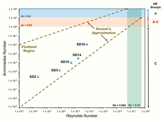 The Ar number can be used similarly to characterize fluidizable powders based on Hausner’s classification methods. All of the powders measured were classified as group C powders, despite experimental classification as group A and A/C for SD12 and SD16, as revealed in Table 4. The criterion for group A is to achieve an Ar value of greater than 0.97, and the powders studied herein had Ar numbers that were orders of magnitude lower than this value, suggesting their inability to be fluidized based on Geldart’s classification. As described earlier, most surface-treated powders by experimental evaluation showed group-A-like pressure drop profiles, suggesting uniform fluidization [17]. Figure 4 shows the area of Goosenns’s approximation when plotting Re with Ar [25]. Using this approximation, all of the powders fell into the fluidized region, suggesting improved flowability. When compared to the , the powders were all considered cohesive as the Ar numbers were not above 0.97 and the Re numbers were above 0.54 for all of the powder samples.