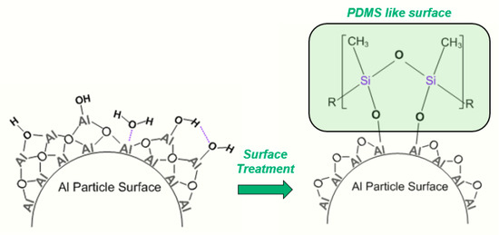 - Ludwig, B.; Gray, J.L. The effect of gas phase polydimethylsiloxane surface treatment of metallic aluminum particles: Surface characterization and flow behavior. Particuology 2017, 30, 92–101. [Google Scholar] [CrossRef]