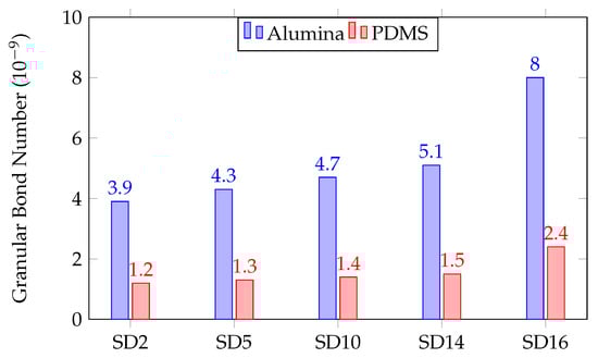 As shown in Figure 7, the change in GBN using the alumina HC resulted in a constant increase of about 10% for SD2–SD14, which was the expected result. At the particle size for SD16, there is a large increase of about 57%. Using the PDMS HC, there is a similar trend with a constant increase of about 8%, followed by an increase of 60%. Overall, the general trend of decreased with PDMS was observed and gave us the anticipated result through having a lower . This is a straightforward explanation and supports our results for the Re number calculated using the empirical and theoretical .