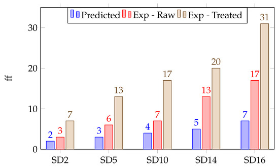 The flow factor was calculated experimentally using powder shear measurements; this can be performed on a variety of different instruments, including rheometers, shear testers, and flow testers. The flow factor gives an indication of how easily a powder will collapse, or the strength of an at-rest, powder column. This property is particularly useful in developing hoppers and capsule-filling devices. For our study, the predicted was compared to the raw and surface-treated powder values. Using the raw powder for calculation of the was not possible due to the non-uniform fluidization using our instrumentation. In this case, the flow factor can be measured through standard shear testing. Figure 8 shows the results for the powders used in this work [27]. As reported in Table 1 in the methods section, the predicted and experimentally determined for raw powders were cohesive and very cohesive for the smaller particle sizes (samples SD2–S10). In all surface-treated cases, the were either easy- or free-flowing.