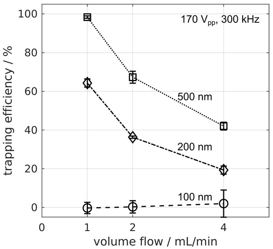 In comparison to the results published in Ref. [16], increasing the voltage (here, 170 Vpp vs. there, 75 Vpp) led to a higher trapping rate of the 500 nm particles of roughly 20% at all flow rates. Following Equation (1), the DEP force increases with electric field magnitude and thus the higher trapping rate is not surprising. The 20% increase is lower than expected, at least for 2 mL/min and 4 mL/min, as the applied voltage is more than doubled. However, the results in Ref. [16] were obtained at a different frequency (15 kHz vs. 300 kHz in this study). A frequency of 300 kHz was selected in this study because of two reasons. First, the selected amplifier is built to amplify signals with a frequency of 100 kHz to 400 MHz, and thus, 15 kHz is out of specification. Second, we observed in our previous study that higher frequencies [24] are beneficial for trapping. The reason behind this is currently not fully understood but reproducible. Frequencies even higher than the selected 300 kHz can lead to a crossover from pDEP to nDEP of the 500 nm particles and thus are not suitable for trapping experiments. Thus, 300 kHz was selected as a compromise. However, 300 kHz could already lead to a decreased of the 500 nm particles. Another reason for the lower than expected trapping might be due to the increasing current flowing at higher voltages and thus higher thermal movement that can reduce trapping. In our experiments, we measured a current of about 1 A. Nonetheless, the recorded trapping is higher than before and complete removal of these 500 nm particles could be observed for 1 mL/min.