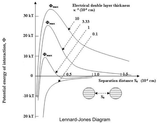 One of the factors that influences particle aggregation is the thickness of the electric double layer around the particle surface. Any parameter favoring a decrease in the electric double-layer thickness—for instance, pH or ionic strength [4]—will augment particle aggregation. A lower electric double-layer thickness leads to a decrease in the energy barrier in the Lennard–Jones diagram (Figure 1) and, thus, makes it easier for particles to aggregate after collision [4].