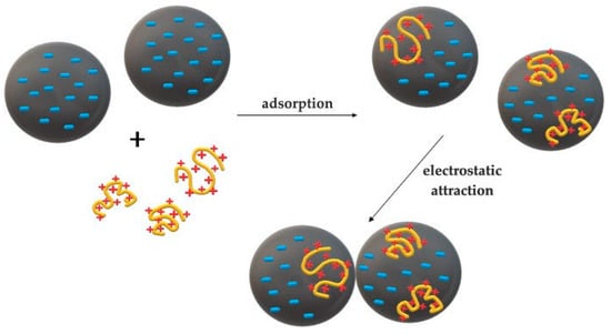 Hydrodynamic interactions can also induce aggregation. Using high-molecular-weight polymers of low to medium charge density, which adsorb on the particle surface, can lead to interactions between the polymer chains. This gives rise to particle aggregation, driven by the so-called “bridging” mechanism (see Figure 3) [38].
