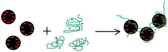 On the other hand, electrostatic interaction between particles of opposite charges leads, naturally, to particle aggregation [4]. This interaction can be the result of opposite charges in a particle’s surface or regions of it, as observed in crystalline systems and clays [16]. Alternatively, it may arise from the creation of zones with an opposite charge in the same particle surface because of additives adsorbing on the particle surface without completely neutralizing it. This can happen, for instance, after using highly charged polymers to induce aggregation, which act based on the “patching” mechanism [4,14] (see Figure 2).