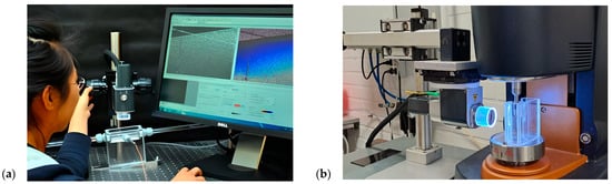(a) Measurement of capillary flow with the Telesto I SD-OCT by Thorlabs, Inc., Newton, NJ, USA. (b) A Rheo–OCT setup where a Telesto I SD-OCT has been combined with a TA instruments rheometer with a transparent vane-in-cup geometry.