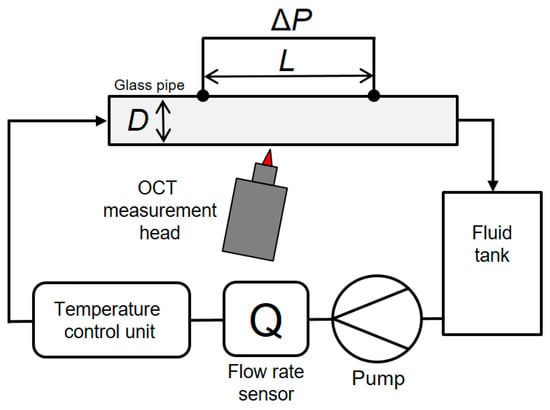 The measurement configuration of Lauri et al. [74]. The CMF suspension was pumped from the fluid tank to the pipe, which included the flow rate sensor and the temperature control unit. OCT and pressure loss measurements were performed in the loop section, which consisted of a glass pipe.