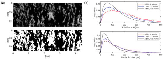 (a) Resized images with a uniform pixel size of 11 µm (upper row) and corresponding Otsu-thresholded images (bottom row) for 0.4% CMF. The white color depicts the fibrils, and black corresponds to water [74]. (b) Floc size distributions in the radial and axial directions at a CMF consistency of 0.4%. The numbers in the legend show the wall shear stress and the flow rate in the pipe. The data were extracted from a graph from [74].