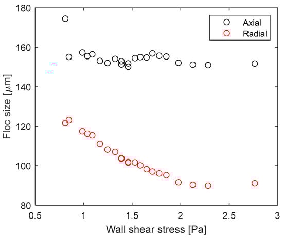 Radial and axial floc sizes as a function of shear stress for 0.4% CMF consistency. The data were extracted from a graph from [74].