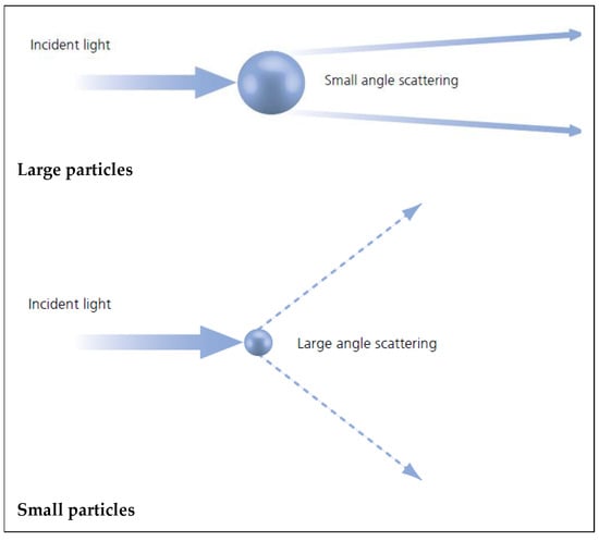 Laser diffraction spectroscopy (LDS) is a particle size analysis technique based on the acquisition of light scattered by particles in the forward direction when a laser beam interferes with the particles. When the particle size is larger than the wavelength, light scatters mainly in the forward direction. Then, if diffraction is the main scattering mechanism, the particle surface conditions the scattered light, and particles of different sizes will scatter light in the forward direction to different scattering angles. Larger particles scatter predominantly for low angles, while small particles will scatter mostly for large angles (see Figure 13) [76].