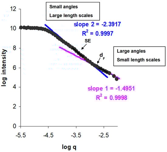 The slope of this plot supplies either the fractal coefficient (dF) or the scattering exponent (SE), depending on the region being considered. It is known that the fractal dimension (dF) (or the scattering exponent) provides a way of expressing the degree to which primary particles fill the space occupied by a nominal volume, supplying information about the particles’ structure, namely, porosity [21,77]. Biggs et al. [22] indicate that scattering patterns at small-length scales refer to the light scattered by primary aggregates, whereas the large-length scales correspond to the light scattered from secondary aggregates that resulted from the aggregation of the primary ones. The coefficient associated with the slope of the small-length scales is the fractal dimension (dF), while the coefficient associated with the slope of large-length scales (larger particles/aggregates) is the scattering exponent (SE) (Figure 14) [77].