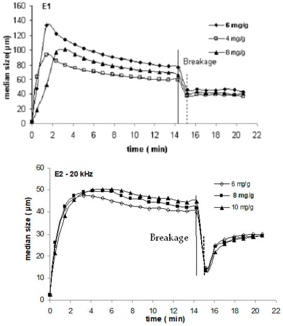 Thus, to be able to monitor the presence or development of aggregates in industrial processes is of high importance to guarantee that the required final product characteristics are obtained and, eventually, to be able to tune process conditions to guarantee that the objectives/characteristics previously defined are reached. Additionally, the pre-evaluation of aggregation in certain processes, based on preliminary lab tests, may be aimed at optimizing the dosage of additives, evaluating the rate of aggregation, or evaluating the properties of the aggregates obtained (size, strength, and structure), as has already been performed, for instance in flocculation processes [21,22,23]. Usually, aggregation can be described based on two parameters: the collision frequency and the collision efficiency [24], and preliminary tests may allow us to obtain information about those parameters [24,25,26].