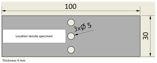 A simple plate-like geometry was chosen to assess the impact of smoulder in parts. The samples measure 30 mm by 3 mm and 100 mm in height (see Figure 1). The smoulder region was about 60 mm in height, while the rest of the sample consisted of virgin powder, which laid above the smoulder region in the powder feedstock. Three cylindrical holes allowed us to assess smoulder congregation at geometrical features. Table 2 presents the most important process parameters, which have been demonstrated to yield satisfactory quality for thick-walled parts [11]. Furthermore, the substrate was heated to 423 K (150 °C) to reduce residual stress formation. The build job of smoulder-containing parts lasted 22 h. The hatch scan strategy involves dividing each irradiated area into its contour and its center, where the laser scans the area in patches with a maximum track length of 10 mm.