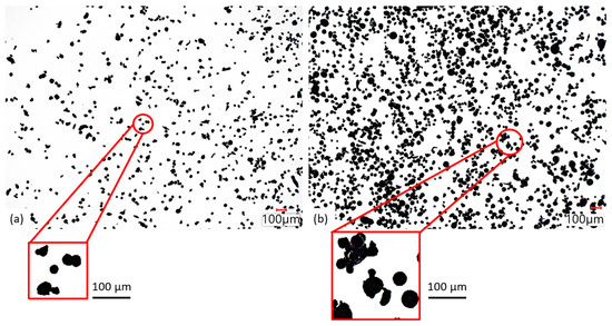 In microscopic analysis, particles lay as dense as shown in Figure 2a,b. Closer packing could lead to misinterpretations in automatic analysis as particle accumulations would be treated as one large particle. Five images per powder type, such as these, provide the aforementioned amounts of analyzed particles. Zoom sections display typical particle morphologies, including agglomerates and satellites. Especially in the smoulder images, there are elongated particles and satellites, while agglomerates can be observed for both powder types.