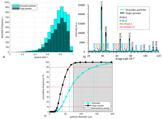 (a) Particle morphology distribution, (b) indexed XRD pattern and (c) particle size distribution of smoulder compared to virgin powder.