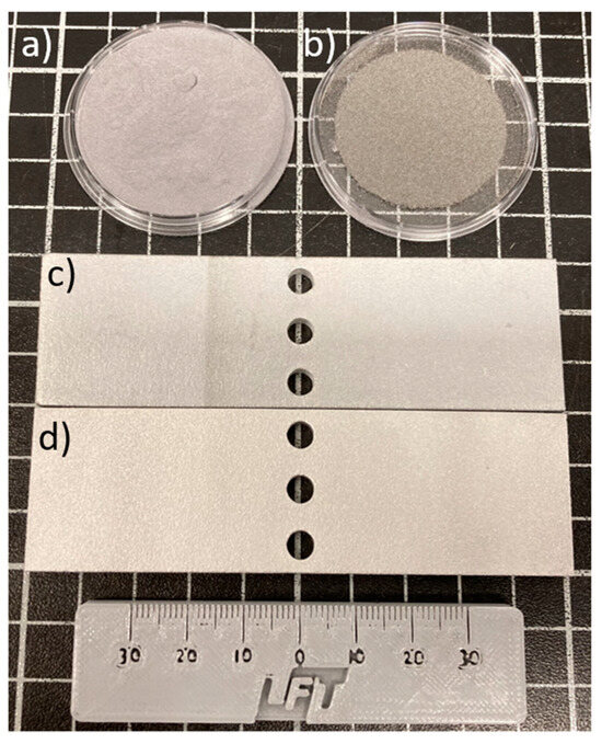 Smoulder and virgin powder are sieved before serving as a feedstock material in the L-PBF process. Smoulder-containing regions of all samples show a different coloration than the regions fabricated from virgin powder. As depicted in Figure 4, coloration of powder particles matches surface coloration of a sample (a–c). After exemplarily sandblasting one sample (d), surfaces of smoulder-containing and virgin regions appeared almost identical, suggesting that effects localize in a very thin zone at the surface. Geometrical features like cylindrical holes do not seem to influence surface coloration, as there is no accumulation of smoulder colors at their contours. This leads to the conclusion that smoulder usage in a build job does not result in visible gradients of properties and does not affect quality. Different parameter regimes inside a scan pattern may explain near surface color changes. The parameter set used in this study irradiates the core of each layer first with the hatch parameter and, after that, the contour with adjusted parameters. Crystallization kinetics may then push color changing particles inside the melt pool to the surface of the part.