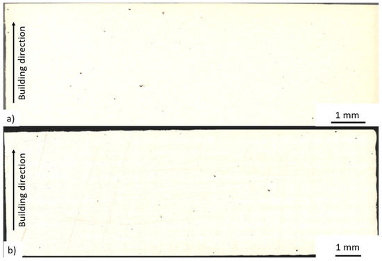 All the samples remained in their as-built state after fabrication. However, the surface of each plate facing towards the substrate was post-processed by sawing the samples off the substrate. First, visual inspection and metallographic preparation on SiC-sandpaper (320–1200 graining) and textile polishing cloths (6 µm–1 µm diamond suspension) without etching were carried out to find obvious defects on surfaces and non-metallic inclusions. Polished samples were examined using the digital microscope VHX-7000 (Keyence Corp., Osaka, Japan).