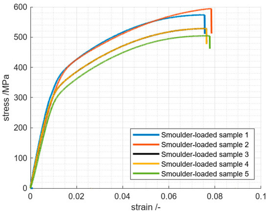 Engineering stress–strain curves of smoulder-containing samples fabricated by L-PBF.