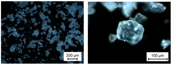 Epoxy powder was supplied by ÉireComposites Teo. (Galway, Ireland), under the product number GRN 918. Note, this was the same epoxy powder used in other works [14,20] under its original product number PE6405. Optical micrographs of the epoxy powder are shown in Figure 2, as well as the differential volume distribution of particle sizes. Optical microscopy was performed using a Zeiss Axioskop 2 (Zeiss, Cambridge, UK) fitted with an AxioCam MRc 5 camera (Leica Microsystems, Milton Keynes, UK). The particle size analysis was performed using a Beckmann Coulter LS100, which uses laser diffraction to measure grain sizes in a liquid suspension. For mechanical testing, the epoxy powder was combined with a 1200 g/m2, stitched unidirectional glass fabric (UD-GF) supplied by Johns Manville (Denver, CO, USA).