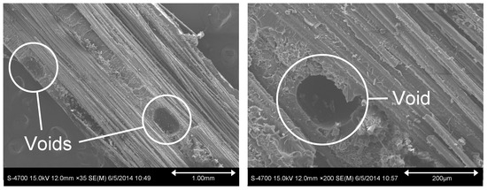 As shown in Figure 4, the presence of voids resulted in a significant reduction in the transverse flexural strength (i.e., 43.4%). This reduction was unsurprising as void defects affect load transfer between polymer and fibres, and can aid crack growth [47]. Moreover, it was in agreement with the findings of Patou et al. [48] who reported a 40% reduction in flexural strength for woven powdered laminates when the void content increased from 1.5% to 4.5%. Using SEM, voids were also observed at the fracture surface of the undried test specimens, confirming their influence on mechanical failure (see Figure 5). In contrast, the absence of void defects at the fracture surface of the dried specimens indicated that failure did not occur due to voids in that case.