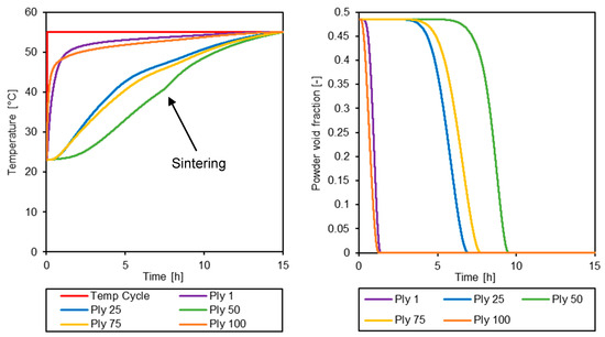 Simulated results for a 100-ply laminate processed using a standard drying stage (i.e., 55 °C for 15 h). Data were taken from equispaced locations through the thickness of the laminate. (Top Left) Temperature plots show that heat was slow to transfer through the laminate when in powder form, but the rate increased as the powder sintered (Top Right). (Bottom Left) Most of the moisture desorbed before the powder sintered; however, magnifying the plot (Bottom Right) revealed that the outside of the laminate (Plies 1 and 100) sintered before they could be dried completely.