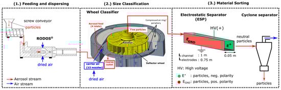 In contrast to wet processes, dry sorting processes are characterized by a high throughput, continuous processes, and the complete elimination of chemical additives and complex drying steps []. While simple dry sorting processes based on triboelectric charging have been implemented in the size range of several 10 µm [,], dry material-specific separation in the range of a few micrometers down to the submicron size range is still pending.