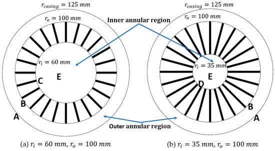 In this investigation, two different blade designs of the deflector wheel were used (Figure 2), each with a different length, resulting in distinct sizes of the inner annular region due to their varying inner radii. The classifier casing has a radius of 125 mm. Both blade designs share an outer radius of 100 mm but possess different inner radii of 60 mm (case labeled as 60–100) and 35 mm (case labeled as 35–100), respectively.