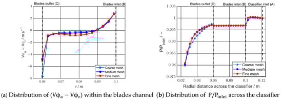 This study employed a hybrid mesh, with tetrahedral elements in more complex regions and hexahedral elements in areas with simpler geometries. This method ensured adequate accuracy in crucial areas while maximizing computational efficiency. Three different meshes were produced with a refinement ratio of about 2 to study grid independence. The refinement ratio is defined as the ratio between the grid spacing of the coarse and medium meshes, as well as between the medium and fine meshes. The total number of mesh elements is 10,243,185 for the coarse mesh, 19,387,890 for the medium mesh, and 37,655,375 for the fine mesh. Figure 4 provides an example of the grid independence achieved in the study. Figure 4a shows the distribution of the circumferential velocity of the air () relative to the rotational speed of the blades () from the blades’ inlet to outlet, for the blades with the (60–100) configuration. The quantity () is a crucial parameter that defines the performance of the classifier and the flow uniformity in the blades region as discussed in []. The distributions of () within the blade channels, as shown in Figure 4a, were calculated using the three prespecified different meshes under the same operating conditions. Another crucial parameter for the classifier’s performance is the pressure drop. Figure 4b shows the distribution of the total pressure across the classifier relative to that at the inlet of the classifier ). Figure 4a,b show minor deviations between the calculations performed with the three different meshes, with all meshes producing the same flow pattern. These minor deviations observed in the distributions of and , calculated across different mesh refinements, confirm grid independence. The finest mesh was used for further investigations in this study.