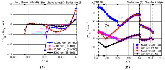 The term () represents this difference and is depicted for both blade designs from the blades’ inlet (outer radius) to the blades’ outlet (inner radius) at two different rotational speeds, as shown in Figure 7a. In Figure 7b, the absolute circumferential velocity () (circumferential velocity relative to a stationary frame of reference) for the same cases is represented from the classifier inlet to the center. It can be observed from the two figures that both blade designs exhibit almost the same profile of () and (), for as long as the flow exists within the blades channels; however, as the flow exits the blade channels, there is a significant disparity in circumferential velocity.