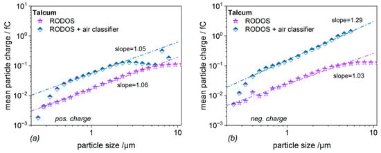 When the RODOS is combined with the classifier, it greatly enhances the average charge of, e.g., 1 µm talcum particles—approximately 3.3 times more for positively charged particles and 5.5 times more for negatively charged particles. Smaller particles show identical charge behavior to larger ones if solely using the RODOS disperser. Still, when used in conjunction with the classifier, different charging characteristics for smaller and larger particles are exhibited, leading to a significantly reduced charge for particles up to 0.5 µm. In the RODOS, the material is mostly conveyed into the system as particle agglomerates, where it is mixed with air and accelerated utilizing a free jet. The particles’ impact on the walls of the rectangular dispersing section disintegrates existing agglomerates. As agglomerates, even small particles may overcome the viscous boundary layer and collect charge due to intensive particle–wall contact. This leads to the consistent particle charging in the RODOS, showing a particle charge proportional to the particle size from the smallest (0.3 µm) to the largest (6 µm) observed size. Only for even larger particles (above 6 µm) does the particle charge become size-independent. However, in this size range, the number of particles is already greatly reduced, and the apparent results suffer from poor statistics.