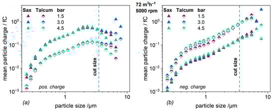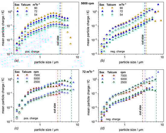 Figure 13 illustrates the calculated mean particle charges for each size class of Saxolith 2 and talcum as the volume flow rates increase at a constant rotational speed of 5000 rpm (Figure 13a,b) and when the rotational speed increases at a constant flow rate of 72 m3 h −1 (Figure 13c,d).