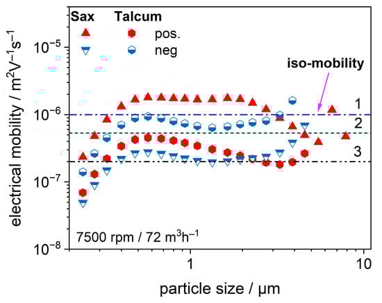 By adjusting the field strength in the ESP to align with iso-mobility line 1 or 2, efficient separation of positively charged Saxolith 2 particles from talcum particles may be achieved. A lower field strength above line 1 results in the deposition of Saxolith 2 with high purity at the negative electrode. However, losses occur in the outer areas of the distribution (x < 0.5 µm or x > 2 µm), as the particles are not mobile enough to be separated and instead enter the downstream cyclone. A higher field strength, demonstrated by line 3, minimizes the mass losses of Saxolith 2 and talcum, respectively. But this also leads to decreasing selectivity, as the less mobile talcum particles may now be deposited on the electrodes.