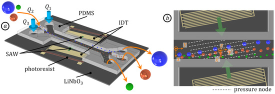 Highly specific particle suspensions with a defined distribution in the material properties are key for high-quality products in process engineering, life science, biomedicine, and pharmacology [1,2,3]. To achieve the required composition in micro- and nanoparticle suspensions, numerous separation technologies based on miniaturized Lab-on-a-Chip devices emerged successfully [4,5,6,7]. These technologies led to the development of passive and active devices. Passive devices are robust and enable a high throughput by means of special channel geometries [8,9,10], embedded microstructures [11], or filtration systems [12,13]. In contrast, active devices are characterized by a higher flexibility and scalability, utilizing, for example, electric [14,15,16], magnetic [17,18,19], or acoustic fields [20,21]. In recent years, surface acoustic waves (SAWs) integrated in microfluidic devices have been demonstrated as a label-free, biocompatible, and non-invasive technology for continuous particle separation [22,23,24,25]. In those devices, the trajectories of suspended particles are manipulated by tailored acoustic fields utilizing the acoustic radiation force and Stokes’ drag due to the acoustically induced fluid flow [26,27]. Exploiting the scaling of the acoustic radiation force with the particle volume [28,29] and acoustic contrast factor [30,31,32], i.e., the density and isentropic compressibility of the particles relative to the surrounding fluid, particles can be separated in a multidimensional manner regarding their size, density, and compressibility.