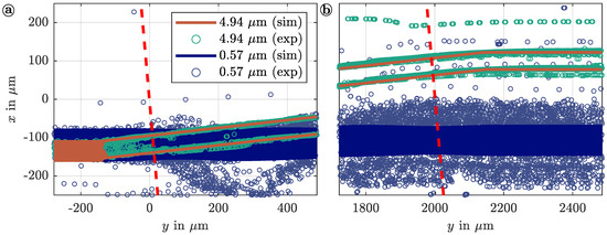 Measured positions (exp) and numerically calculated trajectories (sim) of polystyrene particles with two different sizes at the beginning (a) and end (b) of the IDTs. The edges of the opposite IDTs are indicated by red dashed lines.