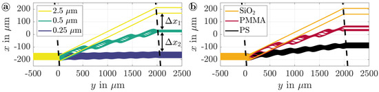 Numerically calculated trajectories of particles with (a) different radii (−1, , polystyrene) and (b) materials (−1, , , silicon dioxide (), polymethylmethacrylate (PMMA), polystyrene (PS)). The motion of the particles is affected by a tasSAW with a tilt angle of within the dashed lines. Main flow is applied in the positive y-direction.