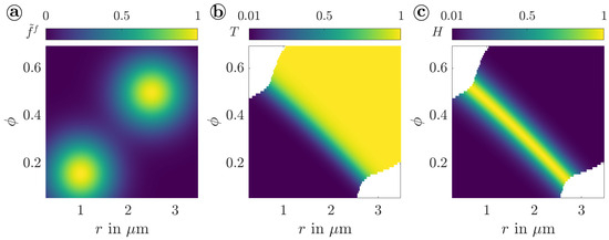 The scaling of with the particle volume and the acoustic contrast factor further permits a multidimensional particle separation as shown in Figure 5. Instead of selecting discrete compositions in the separation criteria, particles with Gaussian distributions around radii of 1 μ and μ and acoustic contrast factors around 0.16 and 0.5 were chosen as feed material, as commonly used in process engineering as well as biomedical and pharmaceutical applications, e.g., using particles made of silicon dioxide or polystyrene. The standard deviation in both distributions amounts to 1 μ and 0.1 for the radii and acoustic contrast factors, respectively. The separation result is evaluated using the Tromp function T, which gives a measure for the probability of particles being separated into the concentrate [73,74,75]. According to Figure 5b, large particles with a high acoustic contrast factor () and small particles with a low acoustic contrast factor () are reliably separated. However, particles separated inconsistently are indicated in a narrow band, in which the Tromp function rises rapidly from to . This narrow transition range is clearly visible based on the Shannon entropy H [73,74,75] in Figure 5c. More than 85% of the particles are located in a region of low entropy, , where the particles are consistently collected in the same outlet. However, the natural limits of the separation technique are reflected by a higher entropy, indicating particles that were pushed ambiguously into different outlets. This narrow band of higher entropy remains tilted in the -plane, highlighting the multidimensional separation effect by size and acoustic contrast factor.