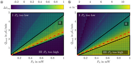 In Figure 6a,b, the maximum separation distance (normalized by its maximum) and the corresponding angle are illustrated against the control parameters, respectively. Three regions (I–III) are evident in the separation results. In regions I and III, a separation with less than half the separation distance () achievable with optimal settings of the control parameters is indicated, as the electrical power supplied to the IDTs is too low or too high for the given volume flow rate, respectively. As a result, the separation of the medium-sized μ particles becomes challenging. However, a particle separation with is achieved in region II. Within this region of control parameters, the optimum tilt angle increases with for a given volume flow rate. Simultaneously, increases up to a maximum along the red dashed line with a corresponding angle close to . In order to obtain widely separated particle trajectories in the given configuration, the tilt angle is thus set to in further considerations. However, a smaller tilt angle revealed beneficial for particle separation with a higher throughput at a given input power as depicted in Figure 6b. Hence, to maximize the processable throughput at a limited input power, a smaller tilt angle is preferred. Please note that the evaluation was based on the separation of particles with radii of μ, μ, and μ, and the optimal tilt angle might deviate for particle suspensions of different sizes [48,76].