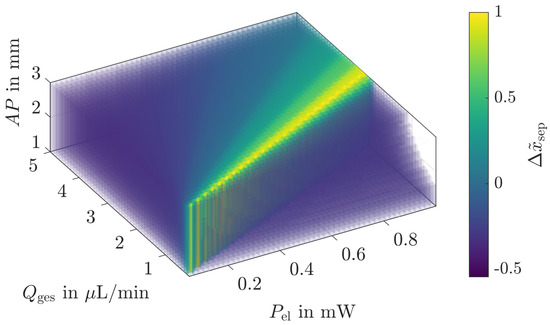 Three-dimensional representation of the normalized separation distance achieved by varying the input power , the volume flow rate , and the aperture . In the separation, particles with radii of , , and were used.