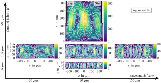In Figure 8, measured and calculated flow patterns in the center of the sSAW are compared for different wavelengths of the SAW and channel heights. In all experiments, the width of the microchannel was kept constant at 500 μ. Although a higher separation distance is feasible with increasing channel width, the counter-propagating SAWs are attenuated more strongly and the acoustically induced fluid flow is enhanced [40]. By adapting crucial parameters in the numerical model, e.g., the acoustic impedance of PDMS and the speed of sound of the fluid, excellent agreement between experimental and numerical results was achieved both qualitatively and quantitatively [51]. A transition from vortex structures that extend far across the channel cross-section to periodic flow patterns can be identified with increasing wavelength and decreasing channel height. In the case of or , these vortices are spatially limited between two neighboring pressure nodes. This is advantageous for separation, as particles with a small radius or low acoustic contrast factor that tend to follow the fluid flow are not dispersed over the entire channel cross-section. A critical channel height and width were derived from a structural analysis to obtain periodic flow patterns, using the Rayleigh angle [51].