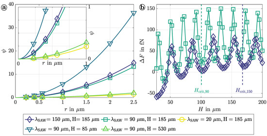 Mean force coefficient against the particle radius r for different configurations of (, H) (a). The course of up to a particle radius of and is shown in the inset. The numerical data were linked by quadratic regression. This subfigure was adapted from Sachs et al. (2022) [51]. Average force difference as a function of the channel height H for wavelengths of 90 and 150 with the corresponding critical channel heights and highlighted by dashed lines (b). The volume flow rate and electrical power were set constant at −1 and , respectively.