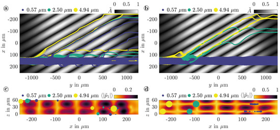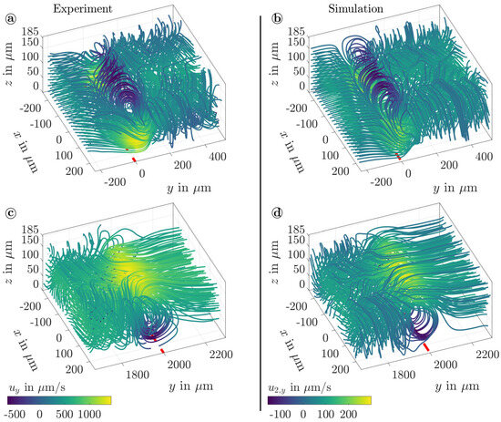 (i) Strong gradients in the displacement amplitude of the sSAW are evident at the beginning and end of the aperture of the IDTs. These gradients translate into the acoustic fields within the fluid domain and generate a body force that drives three-dimensional, acoustically induced vortex structures in the outer regions. In Figure 10a,c, the experimentally observed patterns of the fluid flows at the beginning and end of the sSAW are depicted for a SAW wavelength of , respectively [54]. Due to the interaction with the pressure-driven main flow, the vortices form near the channel ceiling at the beginning and near the bottom at the end of the sSAW. Consequently, the fluid velocity in the main flow direction (y) increases locally. Furthermore, the acoustically induced vortex structures might influence the particle trajectories during separation. In particular, there is a risk of lateral displacement of pre-positioned particles at the beginning and remixing of already separated particles at the end of the sSAW. Based on a comprehensive experimental analysis of the fluid flow, the use of large wavelengths of the sSAW and low channel heights is found to reduce the influence of the induced vortices. For a detailed discussion, the interested reader is referred to Sachs et al. (2022) [54]. To improve the design of acoustofluidic devices based on the revealed fundamental dependencies, a three-dimensional numerical model was set up to calculate the fluid flow. In Figure 10b,d, the numerically calculated velocity fields at the beginning and end of the sSAW are illustrated by streamlines, respectively. To limit the numerical effort, the wavelength was increased to . Furthermore, the surface displacement A by the sSAW was specified analytically as a boundary condition at the channel bottom without variation in the y-direction [51]. Hence, gradients in A are overestimated in the outer regions. However, the numerical results indicate an excellent agreement with the patterns of the experimentally detected vortices. Consequently, the numerical model allows for the integration of the influence of the acoustically induced fluid flow on the particle trajectories in a flexible manner as described below.