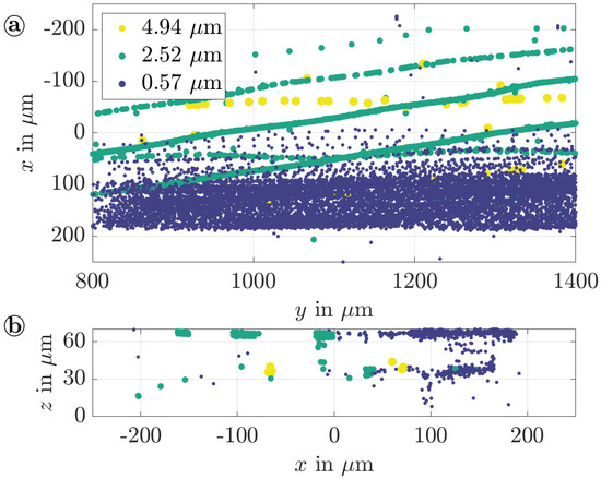 Measured positions of particles with radii of , , and from a top view (a) and in the channel cross-section (b) of the tasSAW device (, , , −1). A main flow was applied in positive y-direction.