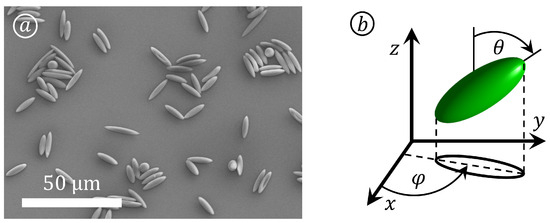 Prolate spheroids dried on a silicon wafer and recorded by scanning electron microscopy (a). The position () and orientation () of the non-spherical particles is defined in the coordinate system given in (b), which was adapted from Sachs et al. (2023) [57].