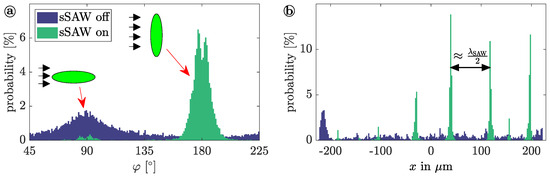 Relative frequency of the detected in-plane angle (a) and position x of particles along the channel width (b). The preferred orientation of the prolate spheroids with and without the influence of the sSAW is indicated by green ellipses with the main flow direction indicated by black arrows. This figure was adapted from Sachs et al. (2023) [57].