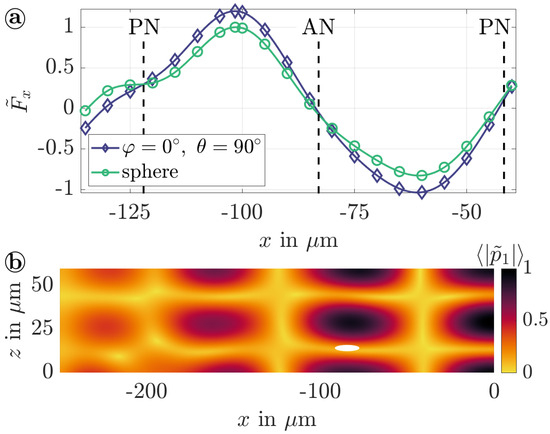 Based on a three-dimensional numerical model, the acoustic force was integrated across the equilibrium surface of a particle modeled within the fluid domain. Following the numerical approach, a potential separation of a spherical particle and prolate spheroid oriented at () with identical volume was investigated. Due to the promising results on the particle separation in a microchannel with a ceiling of high acoustic impedance (see Section 3.3), the channel cover was designed of glass with an acoustic impedance of −1. In Figure 16a, the normalized acoustic force component acting on the spherical and non-spherical particle is depicted along the x-position for a shift between two neighboring pressure nodes (PN). For both particles, the acoustic force takes positive/negative values on the left/right side of the antinode (AN) of the acoustic pressure field, respectively. Hence, the particles are pushed to a stable position in the pressure minima between neighboring antinodes along the channel height (see Figure 16b). To separate the particles in a tasSAW device, differences in the maximum acoustic force are crucial for the particles to selectively follow the pressure nodes. In the given design of the acoustofluidic device, the acoustic force applied to the prolate spheroid exceeds the force exerted on the spherical particle by approx. %. Consequently, the separation of the isovolumetric particles according to their shape is feasible, rendering the acoustofluidic separation multidimensional in the separation criteria, including the particle size, acoustic contrast factor, and particle shape.