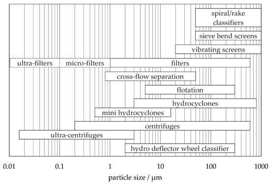 In the context of processes, a distinction can be made between two categories of separation. The first uses a physical particle property, such as size, shape, density or wettability, in order to obtain the particle fractions with a narrow distribution of that property [,,,]. Müller provides a comprehensive overview of solid–liquid separation processes, including limits and applicable particle size ranges []. This overview is illustrated in Figure 1 and extended by further separation approaches [,]. The second category of processes is based on the separation according to chemical particle properties, including chemical composition, dielectrophoretic and magnetic properties and zeta potential [,,,]. In the case of simultaneous separation based on more than one particle property, the process is referred to as multidimensional separation [,].
